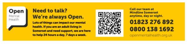 If you need to speak to someone, please contact Mindline Somerset. They are available any time of the day or night, locally on 01823 276892 or freephone 0800 138 1692